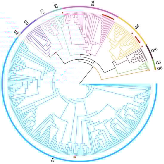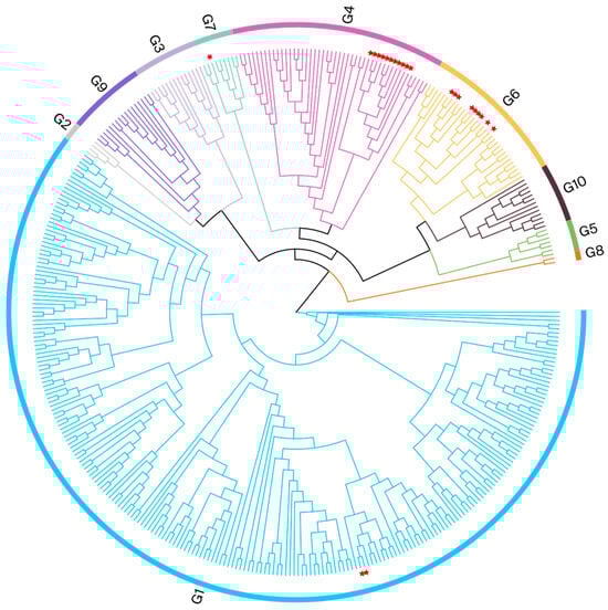 The G4 genotype is also widely distributed, particularly in certain European [,] and American countries []. In Asia, the G4 genotype was initially detected only in Mongolia []; however, it has since been identified in other Asian countries [], including China. Finally, the G6 genotype is mainly prevalent within countries in the Americas [] and Asia [,].