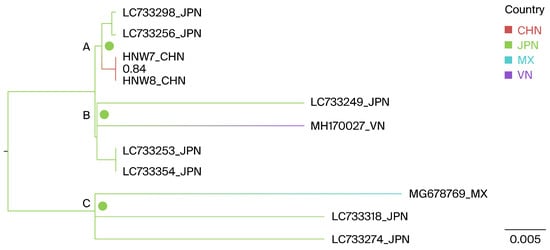 Geographically annotated MCC trees were used to infer the potential origins of the Henan G1 strains. The results indicate that the two Henan G1 isolates, as well as the Vietnamese MH170027 and the Mexican MG678769, likely originated from Japan, with ancestral state posterior probabilities of 1.0, 0.998, and 1.0, respectively, as shown at nodes A, B, and C in Figure 4.