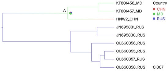 Phylogeographic reconstruction of the BLV G7 genotype. The MCC tree was constructed using full-length env gene sequences; within the Henan G7 clade, countries were treated as discrete character states. Pie charts at the nodes depict the state posterior probabilities for each country. The label A represents the note. Branch colors correspond to the inferred ancestral country with the highest probability, with color transitions representing shifts in the country. CHN, China; RUS, Russia; MD, Moldova.