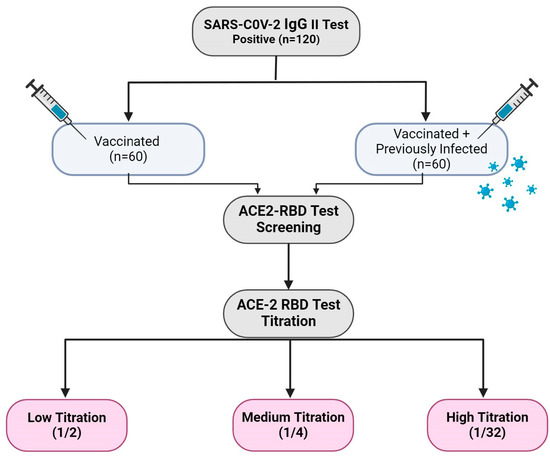 The working plan of the study group. The study included 120 individuals who had SARS-CoV-2 IgG antibodies. Seropositive individuals were divided into two groups: Vaccinated (n = 60) and Vaccinated + Previously Infected (n = 60). ACE2 RBD screening and titration tests were applied to the SARS-CoV-2 IgG-positive samples (Created with BioRender.com).