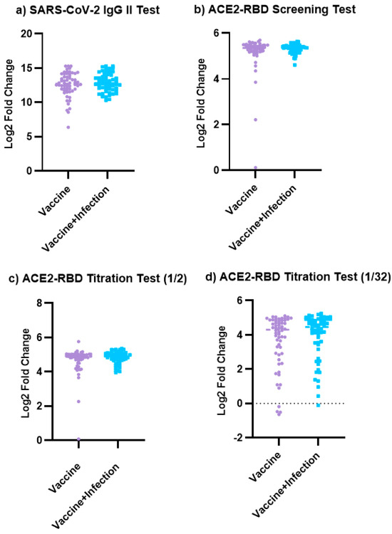 The results of the SARS-CoV-2 IgG test, ACE2-RBD screening, and 1/4 and 1/32 titration tests in the Vaccinated and Vaccinated + Previously Infected groups were compared. No significant difference was detected between the two groups for all tests (p = 0.299, p = 0.159, p = 0.257, and p = 0.168, respectively). These findings are illustrated in Figure 2.