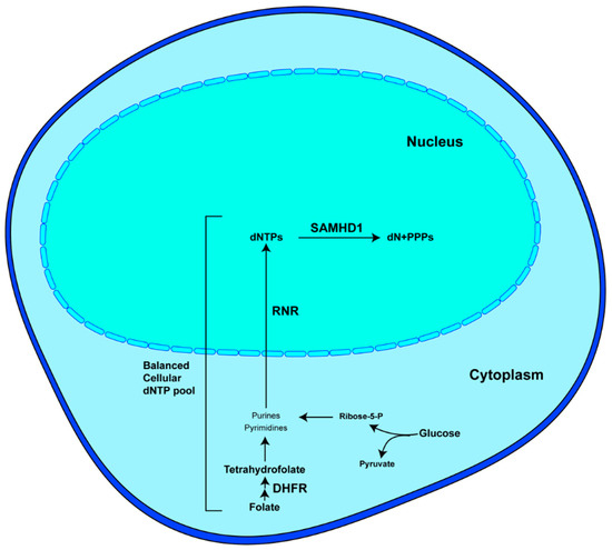 Deoxynucleoside triphosphates (dNTPs) are essential for the replication and maintenance of genomic information in cells and various viral pathogens. The metabolism of dNTPs involves several cellular enzymes, including dihydrofolate reductase (DHFR), ribonucleotide reductase (RNR), SAM domain and HD domain-containing protein 1 (SAMHD1), and thymidine kinase (TK), among others (Figure 1). Steady-state intracellular dNTP pools are maintained through regulated cellular processes dedicated to the synthesis and degradation of dNTP molecules. Enzymes like RNR and TK contribute to dNTP biosynthesis, while SAMHD1 degrades dNTPs into 2′-deoxynucleosides (dNs) and triphosphates (PPPi) through its dNTP triphosphohydrolase (dNTPase) activity [1,2,3,4].