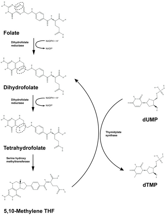 Folate metabolic pathway [5,6,7,8]. DHFR catalyzes the transfer of a hydride from the cofactor nicotinamide adenine dinucleotide phosphate (NADPH), which serves as an electron donor, to dihydrofolate (DHF), resulting in the production of tetrahydrofolate (THF) through protonation. Specifically, DHFR facilitates the reduction of 7,8-dihydrofolate to 5,6,7,8-tetrahydrofolate using NADPH as a cofactor. Additionally, DHFR works in conjunction with thymidylate synthase, which catalyzes the reductive methylation of deoxyuridine monophosphate (dUMP) to deoxythymidine monophosphate, using N5-N10-methylenetetrahydrofolate (5,10-Methylene THF) as a cofactor.
