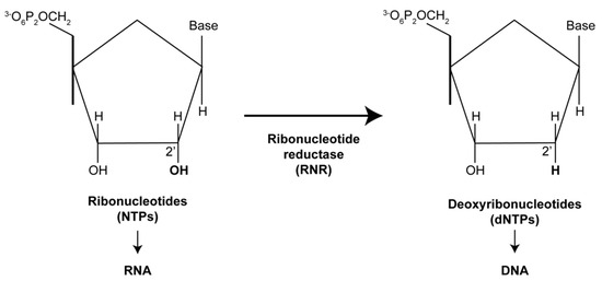 RNRs catalyze the reduction of the hydroxyl group on the second carbon of ribose, converting ribonucleotides (NTPs) into their corresponding deoxyribonucleotides (dNTPs) to promote DNA synthesis (Figure 3) [2,9]. RNR is utilized by all free-living organisms and is a highly regulated, cell cycle-controlled enzyme critical for DNA synthesis and repair [10]. Mammalian RNRs are tetramers (α2β2), consisting of two α subunits (RRM1) and two β subunits (RRM2 or p53R2). The human RRM1 sequence is 792 amino acids in length, RRM2 is 389 amino acids, and p53R2 is 351 amino acids [11]. RRM1 binds nucleoside triphosphate allosteric effectors, while RRM2 contains a tyrosine free radical essential for activity. RRM2 expression is specific to the S phase and is required for DNA replication [12], while p53R2 is expressed throughout the cell cycle, providing dNTPs for mitochondrial DNA synthesis in quiescent cells [13]. RRM1 contains the catalytic site and two different allosteric regulatory sites; RRM2 has a di-iron cofactor and a tyrosyl radical essential for RNR activity.