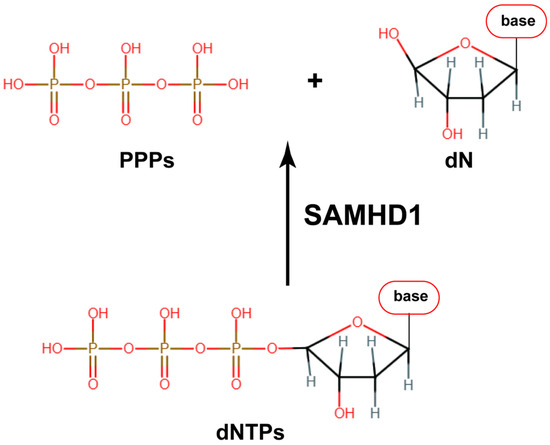 SAMHD1, a deoxyribonucleoside triphosphate triphosphohydrolase, hydrolyzes dNTPs into deoxynucleosides (dNs) and inorganic triphosphates (PPPi) that are either recycled or degraded, thereby limiting the dNTP pool and impairing DNA replication [14].