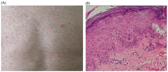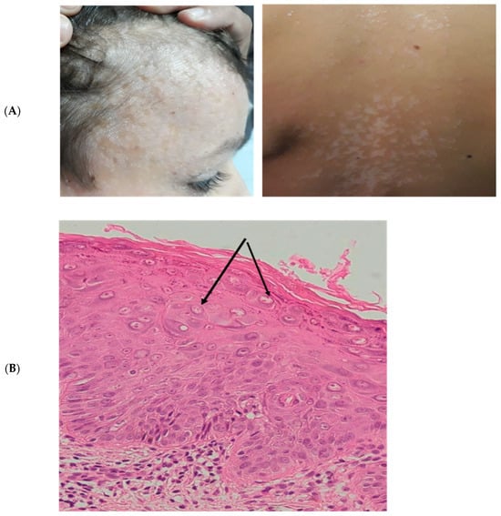(A). Pictures of the lesions on the face and the back of P1. (B). Histological study of Punch skin biopsy showed hyperkeratosis and parakeratosis, mild acanthosis, and the presence of koilocytes, keratinocytes with pale-stained cytoplasm in the upper epidermis associated with high levels of intranuclear viral replication. The cytoplasm of the affected cells stains pale blue which is pathognomonic of epidermodysplasia verruciformis lesions without any sign of malignancy (arrows).