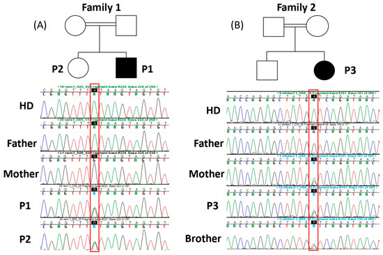 Pedigrees and familial segregation determined by Sanger sequencing of STK4 variants in family 1 (panel A) and family 2 (panel B).
