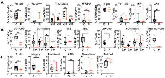 CyTOF analysis on peripheral blood. (A). Proportion of total and subsets of NK cells, of total T cells, total T cells, γδ T cells, iNKT and MAIT cells. (B). Proportion of total and naïve, central memory, effector memory and EMRA CD4+ T cells, T-regulatory, recent thymic emigrant (RTE) T cells and of total and naïve, central memory, effector memory and EMRA CD8+ T cell subsets. (C). Proportion of total and memory, transitional, Age-associated B cells (ABC), plasmablasts, and switched B cell subsets. Age-matched healthy donors (black), patients (red). *, p < 0.05; **, p < 0.01; ns, not significant p ≥ 0.05.