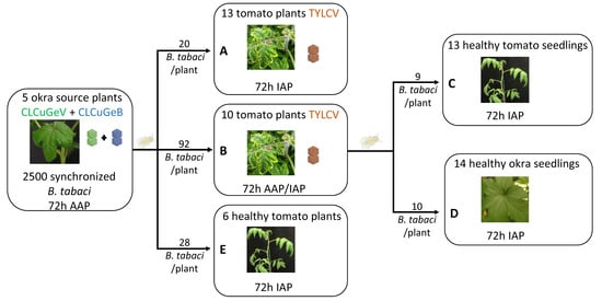 Because the AAP on TYLCV-infected tomato plants (experiment B) lasted 72 h, one may imagine that, during this period, CLCuGeV and CLCuGeB acquired in okra were inoculated in tomato, replicated, and then reacquired by whiteflies. However, previous work monitoring TYLCV translocation in susceptible tomato plants inoculated during 24 or 48 h under high inoculum pressure (50–70 adult whiteflies per plant) showed that the viral DNA is not detected before 4 days in the plant [57,58]. Thus, we consider that most of (or all) the betasatellite particles inoculated into the healthy tomato or okra plants were acquired from the okra source plant and not from the intermediate tomato plants.