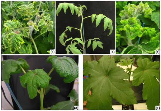Begomoviruses (Family Geminiviridae) are single-stranded DNA viruses causing important damage to different crops [1]. They are transmitted in a persistent circulative manner by whiteflies of the Bemisia tabaci complex [2,3,4], which are polyphagous insects present all over the world [5,6]. Due to this invasive vector and the difficulty in managing viral infections in intensive crop production, begomoviruses have expanded their geographic range in recent decades and are now considered as the main group of emerging plant viruses with a global impact [5,7]. They cause severe symptoms leading to substantial yield losses for various crops of the families Solanaceae (e.g., tomato, pepper, eggplant), Cucurbitaceae (e.g., squash, zucchini, watermelon), or Malvaceae (e.g., cotton, okra, hibiscus) in tropical and subtropical regions [5].