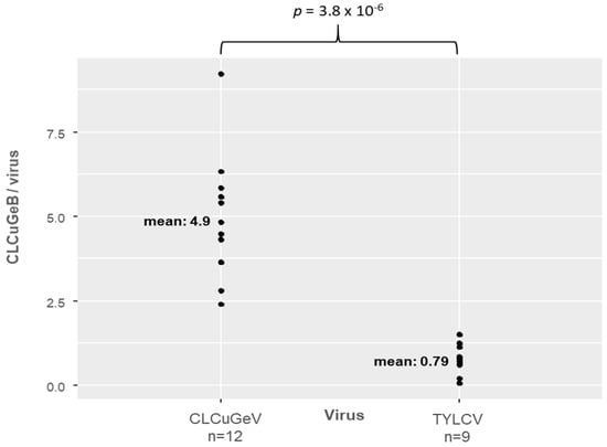 We have shown that whiteflies carrying two begomoviruses and a betasatellite can transmit different begomovirus–betasatellite associations to the respective host plants of each begomovirus and even CLCuGeV in tomato (which is considered as a non-host plant). We compared the accumulation of CLCuGeB relative to each helper virus in each host plant species (i.e., ratio of CLCuGeB to TYLCV in 9 tomato plants of experiment C and of CLCuGeB to CLCuGeV in 12 okra plants of experiment D). The mean ratio of betasatellite to helper virus is higher for CLCuGeV (4.93) than for TYLCV (0.79) (Figure 3 and Table S1) and this difference is statistically significant (p = 3.8 × 10−6). This means that there are 6 times more copies of betasatellite per copy of CLCuGeV in okra plants than per copy of TYLCV in tomato plants. A similar relation between accumulation ratios was also observed between tomato plants coinfected with TYLCV and CLCuGeB in experiment A (Table S1) and the five okra source plants coinfected with CLCuGeV and CLCuGeB (Table S2).