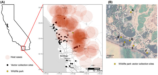 Insect collection sites in San Diego County, California, USA. (A) Location of insect collection sites (black circles) and the wildlife park (yellow circle). The red highlighted box indicates the area of San Diego County (entire county boundary in black) where sampling was conducted. The red circles indicate a 10 km buffer around confirmed or suspected VS premises. (B) Trap locations (n = 6; A–F) at the wildlife park.