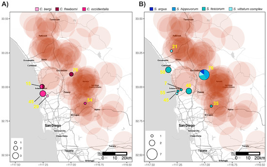 VS-positive premises and insect collections during the 2023 outbreak in San Diego County. Collection locations in San Diego County of VSNJV-positive Culicoides (A) and Simulium (B) pools. Circle size indicates the total number of VSNJV-positive pools collected at each location. Color of circles designates the insect species, as indicated in the legends. Trap sites are numbered in yellow. The large red circles indicate a 10 km buffer around confirmed or suspected VS-infected premises.