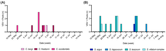 Collection dates of VSNJV-positive Culicoides (A) and Simulium (B) pools during the 2023 outbreak in San Diego County. Color designates the insect species, as indicated in the legends. VSNJV prevalence by species and date is located in Table S3.