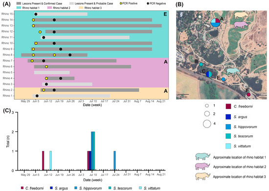 One trapping location was a wildlife park, where six traps were deployed (A–F; Figure 1B and Figure 5B) around the rhinoceros’ habitats. Fifteen rhinoceros with lesion date data were classified as a confirmed VS case based on a VSNJV-positive PCR or a probable case based on consistent clinical symptoms, but were not PCR confirmed (Figure 5A) [40]. Two species of rhinoceros reside at the wildlife park. Ceratotherium simum simum, or the southern white rhinoceros, are located in two enclosures near traps A and E (rhinos 3–15 in Figure 5A,B). Rhinoceros unicornis, or the greater one-horned rhinoceros, are in one enclosure near trap A (rhinos 1–2 in Figure 5A,B).