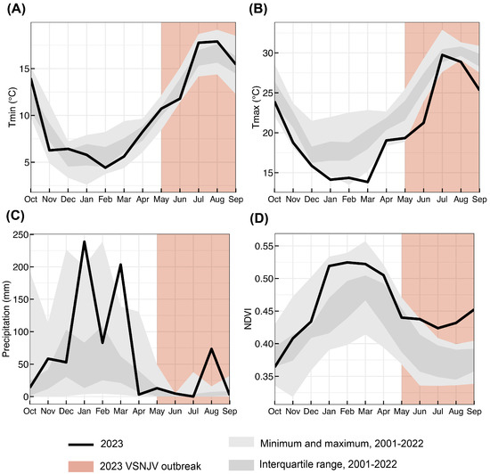 Environmental conditions leading up to and during the 2023 VS outbreak compared to previous 21-year ranges. Black lines indicate (A) minimum temperature, (B) maximum temperature, (C) precipitation, and (D) vegetation greenness (NDVI) for months in water year 2023 (spanning October 2022 to September 2023). Dark gray areas indicate the interquartile ranges for water years 2001–2022. Light gray areas indicate the minimum and maximum monthly values over the 2001–2022 period. Red rectangle from May to September indicates the 2023 VSNJV outbreak.