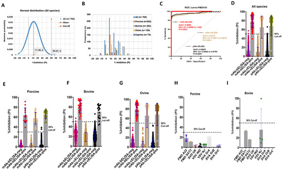 DSp and DSe of FMDV/O-specific mAb-bELISA and comparator ELISAs. (A) Normal distribution of PI obtained from negative serum samples of Canadian healthy animal species (n = 760; porcine, bovine, ovine, and caprine). (B) Frequency distribution of PI in negative animal sera (n = 760 [all species], n = 262 [porcine], n = 264 [bovine], n = 159 [ovine], and n = 75 [caprine]). (C) ROC curve diagnostic sensitivity analysis of FMDV/O mAb-bELISA in contrast to mAb-cELISA and pAb-cELISA. (D–G) Bar graphs show the estimated PI cut-off line and overall DSe of FMDV/O mAb-bELISA and comparator ELISAs for all animal species (D), porcine (E), bovine (F), and ovine (G). (H,I) Cross-reactivity analysis of FMDV/O mAb-bELISA using sera from experimentally infected animals, such as porcine (H) and bovine (I), with other FMDV serotypes and other vesicular diseases. In (A), the red vertical dashed line and grey vertical solid line represent estimated PI cut-off and mean values, respectively. Dashed lines in all bar graphs indicate the estimated PI cut-off.