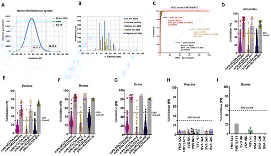 DSp and DSe of FMDV/SAT2-specific mAb-bELISA and comparator ELISAs. (A) Normal distribution of PI obtained from negative serum samples of Canadian healthy animal species (n = 1031). (B) Frequency distribution of PI in naïve negative animal sera (n = 1031 [all species], n = 249 [porcine], n = 263 [bovine], n = 257 [ovine], and n = 262 [caprine]). (C) ROC curve diagnostic sensitivity analysis of FMDV/SAT2 mAb-bELISA compared with mAb-cELISA and pAb-cELISA. (D–G) Bar graphs show the estimated PI cut-off line and overall DSe of FMDV/SAT2 mAb-bELISA and comparator ELISAs for all species (D), porcine (E), bovine (F), and ovine (G). (H,I) Cross-reactivity analysis of FMDV/SAT2 mAb-bELISA using sera from experimentally infected animals, such as porcine (H) and bovine (I), with other FMDV serotypes and other vesicular diseases. In (A), the red vertical dashed line and orange vertical dashed line represent estimated PI cut-off and mean values, respectively. Dashed lines in all bar graphs indicate the estimated PI cut-off.