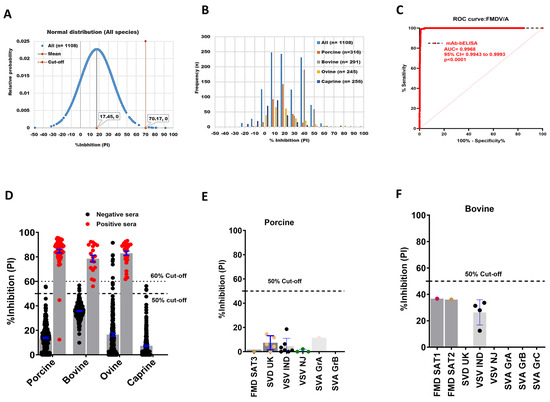 DSp and DSe of FMDV/A-specific mAb-bELISA. (A) Normal distribution of PI recorded from negative serum samples of Canadian healthy animal species (n = 1108). (B) Frequency distribution of PI in negative animal sera (n = 1108 [all species], n = 316 [porcine], n = 291 [bovine], n = 245 [ovine], and n = 256 [caprine]). (C) ROC curve diagnostic sensitivity analysis of FMDV/A mAb-bELISA (D) Bar graph shows the estimated PI cut-off line (either 50% or 60%) and overall DSe of FMDV/A mAb-bELISA for porcine, bovine, and ovine. No positive sera were tested for caprine. (E,F) Cross-reactivity analysis of FMDV/A mAb-bELISA with porcine (E) and bovine (F) sera experimentally infected with other FMDV serotypes and other vesicular diseases. In (A), the red vertical dashed line and grey vertical solid line represent estimated PI cut-off and mean values, respectively. Dashed lines in all bar graphs indicate the estimated PI cut-off.