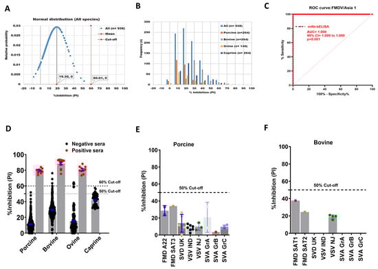 DSp and DSe of FMDV/Asia1-specific mAb-bELISA. (A) Normal distribution of PI obtained from negative serum samples of Canadian healthy animal species (n = 938). (B) Frequency distribution of PI in negative animal sera (n = 938 [all species], n = 264 [porcine], n = 254 [bovine], n = 146 [ovine], and n = 264 [caprine]). (C) ROC curve diagnostic sensitivity analysis of FMDV/Asia1 mAb-bELISA. (D) Bar graph shows the estimated PI cut-off line (either 50% or 60%) and overall DSe of FMDV/Asia1 mAb-bELISA for porcine, bovine, and ovine. No positive sera were tested for caprine. (E,F) Cross-reactivity analysis of FMDV/A mAb-bELISA with porcine (E) and bovine (F) sera experimentally infected with other FMDV serotypes and other vesicular diseases. In (A), the red vertical dashed line and grey vertical solid line represent estimated PI cut-off and mean values, respectively. Dashed lines in all bar graphs indicate the estimated PI cut-off.