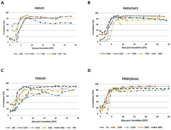 Detection efficiency of FMDV serotype-specific mAb-bELISAs. Pigs, cows, and sheep were experimentally infected with FMDV serotypes O/Manisa, SAT2/SAU, A22/Iraq, and Asia1/Shamir. Serially bled sera were collected at 0–30 dpi and examined by using FMDV/O mAb-bELISA (A), FMDV/SAT2 mAb-bELISA (B), FMDV/A mAb-bELISA (C), and FMDV/Asia1 mAb-bELISA (D). p—pig; c—cow; s—sheep.