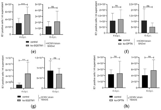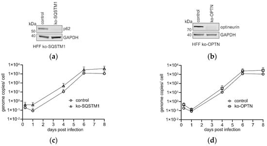 p62 is a multifunctional adaptor protein. We could show in previous studies that p62 interacts with viral structural components in late-stage HCMV-infected cells and associates with viral capsids and viral cytoplasmic assembly compartments (cVACs) [20]. Another receptor, optineurin, was also recruited to cVACs in late-stage HCMV-infected fibroblasts [53]. Thus, knockout HFFs for p62 (HFF ko-SQSTM1) and for optineurin (HFF ko-OPTN) were established by the CRISPR-Cas9 technology (Figure 1a,b). The influence of both p62 and optineurin on viral genome replication was addressed by infecting either ko-SQSTM1, ko-OPTN, or control cells with HCMV, using an infectious dose of four genome copies/cell. Infected cells were collected at different time points after infection. Subsequently, viral DNA was isolated, and quantitative PCR was performed to determine the number of genome copies. Interestingly, a subtle but reproducible enhancement of HCMV genome replication became apparent when viral DNA levels from infected HFF ko-SQSTM1 were compared to those from control HFFs (Figure 1c) as confirmed in four independent experiments. However, no alteration was seen in infected HFF ko-OPTN (Figure 1d), which was analyzed in three individual experiments. To investigate if the lack of p62 or optineurin had an impact on HCMV progeny release, HFF ko-SQSTM1 or HFF ko-OPTN were infected again (m.o.i. of 0.5). The culture supernatants were collected at 4 d.p.i. and 6 d.p.i. The amount of infectious virus per volume of supernatant was analyzed using the IE1-titration assay. Significantly more progeny was released from HFF ko-SQSTM1 at 4 d.p.i. compared to the HFF controls. A similar tendency was seen 6 d.p.i. yet not reaching statistical significance (Figure 1e). In contrast, no difference in viral progeny release was seen when supernatants from HFF ko-OPTN and control HFFs were compared (Figure 1f). Comparable results were obtained when a different HCMV strain (TB40E) was used for infection (Figure 1g,h). The data showed that the absence of p62 in HCMV-infected cells led to an enhancement of progeny release, whereas optineurin deficiency did not seem to have an impact.