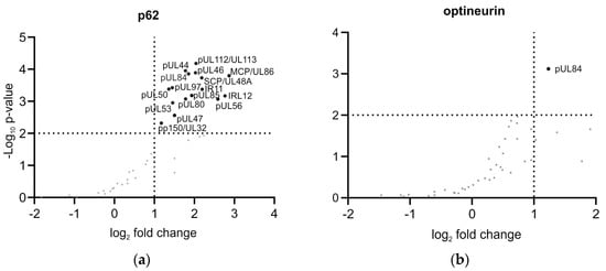 MS analysis of the interaction of p62 (a) and optineurin (b) with HCMV proteins. HFFs, infected with HCMV (m.o.i.= 1) were incubated with protein A/G magnetic beads and specific antibodies against either p62 or optineurin or IgG as control. Precipitates were analyzed and quantified by MS. They were considered significant under the following conditions: one-sided two-sample Student’s t-test with a minimal enrichment factor of 2 (log2(2) = 1), showing the log2 fold change and p < 0.01 (−log10(0.01) = 2). Hits in the upper right quarter are considered significant. All data are deposited at the PRIDE repository (PXD055196).