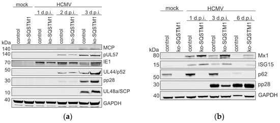 One day before infection, 0.5 × 106 HFFs or knockout HFFs were grown in 10 cm2 dishes. Cells were infected with the respective HCMV strains based on genomes per cell or m.o.i. On different days post-infection, HFFs were collected and adjusted to 1 × 105 cells/10 µL SDS lysis buffer (125 mM Tris; 2% (v/v) β-Mercaptoethanol; 10% (v/v) glycerol; 2% (w/v) SDS; 1 mM EDTA, pH 8,0 and 0.005% (v/v) bromphenolblue). Either 1 × 105 cells to investigate protein levels or 2 × 105 cells to study the phosphorylation of proteins were separated on 10% Bolt™ Bis-Tris Plus gels (NW00100BOX, Thermo Fisher Scientific). The proteins were transferred to a 0.2 µM Immobilon-PSQ PVDF-membrane (ISEQ00010, Merck KGaA). The filter was probed with specific primary antibodies mAb-GAPDH (G87955, Merck KGaA), mAb-IE1 (p63-27), mAb-ISG15 (F-9, sc-166755, Santa Cruz Biotechnology), mAb-LC3B (D11) XP (3868S; Cell Signaling Technology), mAb-MCP (28-4), mAb-UL48a, mAB-pp150 (XPA36.14), and mAb-pp28 (41-18), which were all kindly donated by William Britt, pAb-Mx1 (PA5-22101, Thermo Fischer Scientific), pAb-Optineurin (ab23666, Abcam), pAb-POM121 (PA5-36498, Thermo Fischer Scientific), mAbSQSTM1/p62 [2C11] (ab56416, Abcam), and pAb-SQSTM1/p62 (phospho Ser272) (GTX133943-100, GeneTex, Irvine, CA, USA). Fluorescent-conjugated secondary antibodies (A10043, Thermo Fisher Scientific; 926-32212, LI-COR, Lincoln, NE, USA) were used for detection.