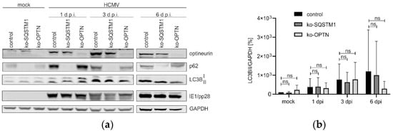 HCMV infection leads to the induction of autophagy, as evidenced by increased levels of LC3B-II. To test whether the lack of p62 had an impact on the induction of autophagy by HCMV, cells were infected, and the levels of LC3B-II were measured at different time points after infection by Western blot (Figure 4a). These LC3B-II levels were quantified using four independent biological replicates and subjected to statistical analysis (Figure 4b). The lack of p62 or optineurin, respectively, had no statistically significant impact on HCMV-induced LC3B levels compared to control cells.