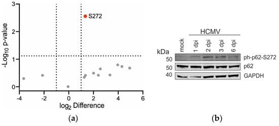 Determination of the phosphorylation status of p62 during HCMV infection. (a) MS analysis of the phosphorylation status of p62 in HCMV-infected versus non-infected HFF-GFP-SQSTM1. The detected phosphorylation sites of p62 of three biological replicates are displayed in a volcano plot, showing the fold change (X-axis) and significance as −log10 p-value (Y-axis). The phosphorylation sites are shown as individual data points. Changes in the phosphorylation status at S272 (colored dot) in infected versus non-infected cells reached significance above the threshold for the fold change of log2 ≥ 1 and p-value-log10 ≤ 0.05, which was represented by the vertical and horizontal dotted lines, respectively. Phosphorylation sites that were detected but did not show significant differences are shown as gray data points. (b) Validation of the phosphoproteomic data in B was performed by Western blot, using a phospho-specific antibody against p62-S272. Lysates of HCMV-infected normal HFF cells were submitted to SDS-PAGE, which was followed by Western blot analysis. The phosphorylation level of p62 at S272 was analyzed at 1, 3, and 6 d.p.i. GAPDH levels were used as loading control. One Western blot of two individual analyses is shown.