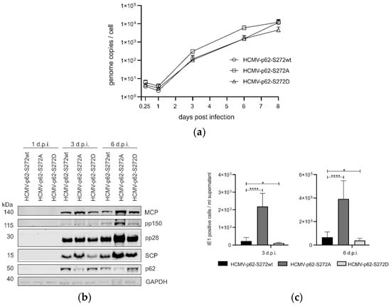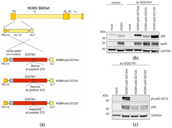 To investigate whether the phosphorylation at S272 has an impact on HCMV infection, viral mutants were generated that expressed either wt-p62, a non-phosphorylated S272A version of p62, or a S272D-mutated version of p62, mimicking phosphorylation (Figure 6a). The recombinant viruses were used to infect HFF ko-SQSTM1. The expression of the different versions of p62 was verified by the immunoblotting of cell lysates from these cells (Figure 6b). Notably, expression levels were different, showing that the steady-state levels of p62-S272A were considerably lower than those of HCMV-p62-S272wt and HCMV-p62-S272D. The absence of phosphorylation of p62 at S272 was also verified by using a phospho-specific antibody (Figure 6c). The levels of HCMV-p62-S272D were lower compared to HCMV-p62-S272wt, which may be due to variations in infection conditions.