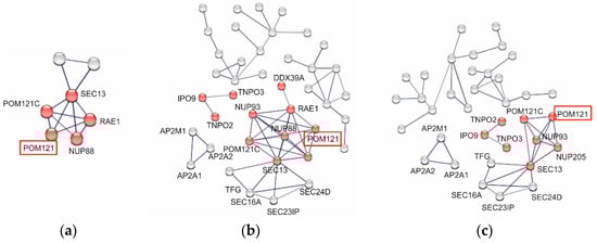 (a–c) Protein–protein interaction networks of the cellular interactors of p62 in dependence on the phosphorylation status at S272, analyzed in samples from co-immunoprecipitation analysis of HCMV-infected HFFs, using the STRING database (http://string-DBs.org, accessed on 10 August 2023). HFFs were infected with either HCMV-p62-S272wt, HCMV-p62-S272A, or HCMV-p62-S272D, respectively, using an m.o.i. of 0.5. Cells were collected at three d.p.i. p62 was immunoprecipitated using a receptor-specific antibody. The amount of p62 used for IP was adjusted to control for reduced steady-state levels of HCMV-p62-S272A-infected cells by using twice the number of lysed cells for IP against p62-S272A compared to p62-S272wt or p62-S272D. Each node represents a protein, and the red nodes represent a cluster of proteins, which are associated with the nuclear pore complex or with nucleocytoplasmic transport. The interaction network was generated with a high confidence interaction score (0.7). Networks of proteins that co-precipitated with p62-S272wt are shown in (a), those co-precipitated with p62-S272A are shown in (b), and those co-precipitated with p62-S272D are shown in (c).