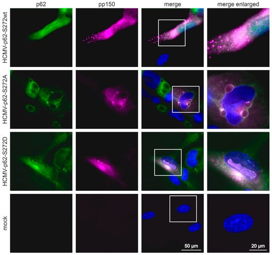 p62 is shuttling between the nucleus and the cytoplasm [57,58]. The phosphorylation of the receptor close to its nuclear localization signal at threonine 269 and serine 272 leads to increased nuclear retention, as shown in transient transfection experiments [10,57]. To address whether the phosphorylation of p62 at S272 also had an impact on the localization of the protein in HCMV-infected cells, indirect immunofluorescence analyses were carried out. HFF-ko-SQSTM1 cells were infected with either HCMV-p62-S272wt, HCMV-p62-S272A, or HCMV-p62-S272D, respectively. At 6 d.p.i., cells were fixed and stained with antibodies against p62 and against the large viral tegument protein pp150 (Figure 8). p62 was found both in the cytoplasm and the nucleus, following infection with HCMV-p62-S272wt or HCMV-p62-S272D. In contrast, an almost complete cytoplasmic retention was seen after infection with HCMV-P62-S272A. This shows that S272 phosphorylation is sufficient to shift p62 toward the nucleus in HCMV-infected cells.
