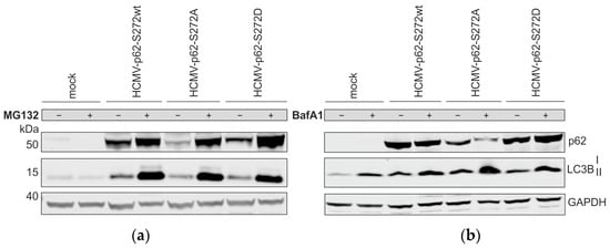 Western blot analysis of the impact of S272 phosphorylation on the proteasomal and autolysosomal degradation of p62. (a) Western blot analysis of p62 levels, following 5-day infection of ko-SQSTM1 cells with respective HCMV-p62-S272 strains (wt/D/A) using an m.o.i. of 0.2. Cells were treated with 10 µM of the proteasomal inhibitor MG132 18 h before sample collection. The results of one of two individual experiments are shown. (b) Western blot analysis of p62 levels applying 200 µM of the lysosomal inhibitor bafilomycin A1 (BafA1) 4 h before cell harvest, n = 1. (a,b) Cell lysates were probed with antibodies against p62, GAPDH (loading control), and LC3B.