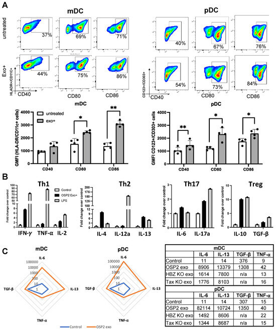 Exosomes activate and elicit proinflammatory responses in dendritic cells. (A) Representative phenotype of myeloid dendritic cell (mDC) and plasmacytoid dendritic cell (pDC) population differences with exosome stimulation (n = 4). GMFI levels of CD40, CD80, and CD86 in mDC and pDC populations untreated or stimulated with exosomes. Bars represent mean ± standard deviation (SD). (B) Expression of cytokines associated with Th1, Th2, Th17, and Treg polarization in total DCs stimulated with OSP2 cell-derived exosomes or LPS. Cytokines were grouped according to associated Th1 (IFN-γ, TNF-α, and IL-2), Th2 (IL-4, IL-12a, and IL-13), Th17 (IL-6 and IL-17a), and Treg (IL-10 and TGF-β) subsets. (C) Cytokine levels (pg/mL) in supernatants of mDCs (left) and pDCs (right) untreated or exosome-stimulated. Statistical differences were determined by one-way ANOVA, * p < 0.05, ** p < 0.005.