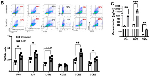 While exosome-mediated immune regulation is commonly observed in CTL responses, few studies have investigated the impact on CD4+ T-helper cells. Given the impact of exosomes on DC maturation and cytokine release, we then evaluated their effects on DC-mediated T-cell polarization. Total DCs pretreated with OSP2-derived exosomes were subsequently co-incubated with donor-matched CD3+ T cells. CD4+ T cells were analyzed for specific helper T-cell associated markers (Figure 2A): Th1 (IFN-γ, CCR5), Th2 (IL-4, CCR4), Th17 (IL-17a, CCR6), and Treg (FoxP3, CD25). The induction of Th2 (p = 0.02) and Treg (p = 0.001) polarization was significantly elevated following exosome exposure, as well as notably increased in the Th1 population, indicating that OSP2-derived exosomes induce T-cell activation overall. A decrease in these cell populations was observed when the exosomes were pretreated with a cocktail of mAb blocking ICPs; however, no significant changes were observed. Consistent with the T-cell polarization results, we observed an elevation in CD4+ T cells expressing IFN-γ (p = 0.03), IL-4 (p = 0.04), and CCR6 (p = 0.04; Figure 2B). The expression of CCR5, a chemokine also involved in the recruitment of Treg cells to sites of infection and inflammation, was significantly increased (p = 0.005), of importance as CCR5 activity can negatively influence Th1 and Treg responses [38]. We also observed significant increases in IFN-γ, TGF-β, and TNF-α in the supernatant, consistent with increases in Th1, Th2 and Treg cell polarization (Figure 2C).