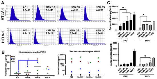 The sera exosomes isolated from HTLV-1-infected individuals diagnosed with HAM/TSP (n = 3) showed a significant elevation in LAG-3 (Lymphocyte-activation gene 3) compared to AC (n = 1) sera-derived exosomes (p = 0.017; Figure 3B). Based on our previous immune checkpoint findings [35], we also evaluated BTLA (B- and T-lymphocyte attenuator), PD-1 (Programmed death-1), and PD-L1 (Programmed death ligand-1). Our results showed that these markers tended to be higher in TSP/HAM patients than AC. No significant differences in ICPs were observed among individuals infected with HTLV-2. As such, postulating whether this difference is due to the lack of specific viral proteins compared to HTLV-1, differences due to virus homology (~70% to HTLV-1), or differences in infectivity remains indefinable [42]. Individuals with HAM/TSP also had elevated IFN-γ and TNF-α levels in their exosomes compared to AC (Figure 3C).