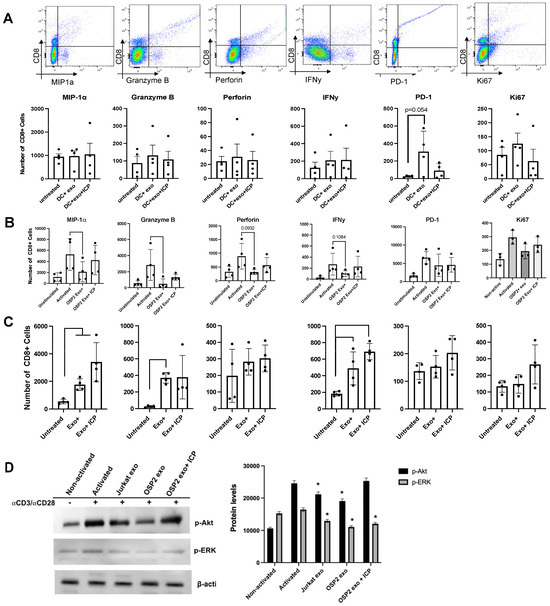 Exosomes diminish CD8+ T-cell activity. (A) Schematic of treatment and gating strategy of CD8+ T cells. CD3+ T cells and total DCs were isolated from matched donors (n = 4). DCs were stimulated with OSP2-derived exosomes for 24 h and subsequently co-incubated with donor-matched T cells for another 24 h. Absolute counts of CD8+ T cells expressing MIP-1a, Granzyme B, Perforin, IFN-γ, PD-1, and Ki67 after co-incubation with exosome-pulsed DCs. (B) Absolute counts of CD8+ T cells after CD3+/CD28+ activation and stimulation with OSP2 exosomes alone, or exosomes incubated with a cocktail of anti-PD-L2, anti-BTLA, anti-LAG-3, and anti-PD-1 blocking antibodies. (C) Absolute counts of CD8+ T cells expressing MIP-1a, Granzyme B, Perforin, IFN-γ, PD-1, and Ki67 in HTLV-1-infected patient T cells (n = 4) stimulated with patient sera exosomes alone or exosomes incubated with a cocktail of anti-PD-L2, anti-BTLA, anti-LAG-3, and anti-PD-1 blocking antibodies. Counts were determined by experiments with n = 3/4 healthy donors, and error bars represent SEM of donor variation. Bars represent mean ± standard deviation (SD). Statistical differences were determined by one-way ANOVA. (D) Western blot and densitometry of CD3/CD28-stimulated T cells treated with Jurkat and OSP2 exosomes alone, or exosomes incubated with a cocktail of anti-PD-L2, anti-BTLA, anti-LAG-3, and anti-PD-1 blocking antibodies. Blot was probed for phosphorylated AKT or ERK. Error bars represent SEM of blot variation; statistical differences were determined by paired two-tailed T-test, * p < 0.05.