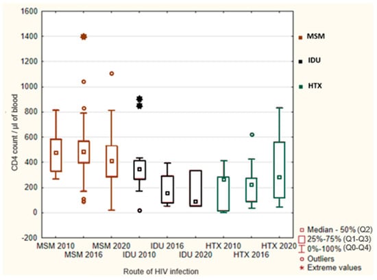 The CD4+ T cell count was statistically significant dependent on the route of infection in 2010 and 2016 (Kruskal–Wallis tests: H = 8.46, df = 2, and p = 0.015 and H = 17.66, df = 2, and p < 0.001.). Each year, MSM had the highest number of the CD4+ T cell count. In 2010, IDUs had the second highest number of the CD4+ T cell count, followed by HTXs. In 2016, we saw a change—the CD4+ T cell count among HTXs was higher than among IDUs. In 2020, the differences in the number of the CD4+ T cell count dependent on the route of infection were statistically insignificant (Kruskal–Wallis test: H = 5.94, df = 2, and p = 0.051) (Table 4) (Figure 1).