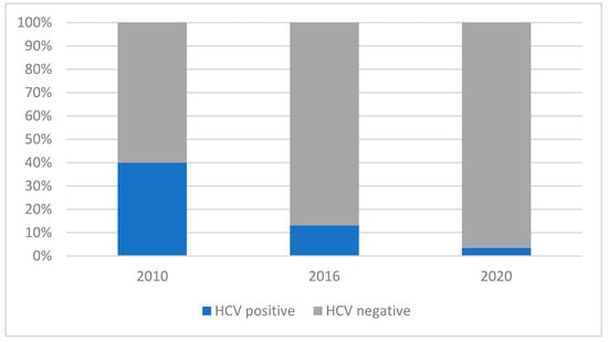 No statistical significance was found between the presence of anti-HCV antibodies and gender in any of the years (2010—Fisher’s test: p > 0.999; 2016—Pearson chi-squared test: χ2 = 10.28, df = 1, and p = 0.001; and 2020—Fisher’s test: p > 0.999)