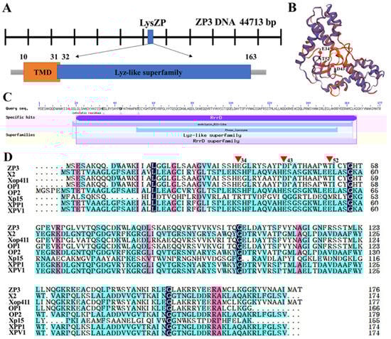 Zhang, M.; Xu, X.; Lv, L.; Luo, J.; Ahmed, T.; Alsakkaf, W.A.A.; Ali, H.M.; Bi, J.; Yan, C.; Gu, C.; et al. Genomic Characterization of Phage ZP3 and Its Endolysin LysZP with Antimicrobial Potential against Xanthomonas oryzae pv. oryzae. Viruses 2024, 16, 1450. https://doi.org/10.3390/v16091450