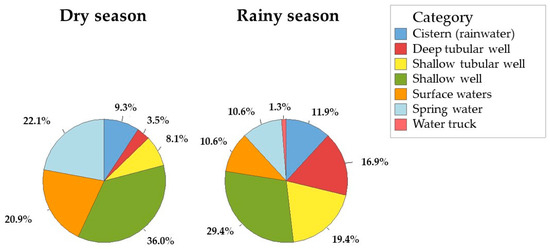 A presentation of the percentage of types of water sources where the research samples were collected. Each pie chart shows the percentages for each period, the dry period and the rainy period. Dry season (n = 86); rainy season (n = 160).