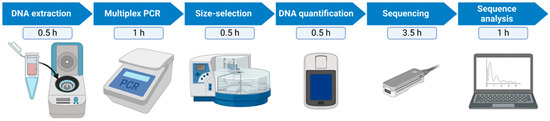 Schematic overview of the different workflow steps and approximate time needed to process 48 samples in parallel. Figure created with BioRender.com (https://app.biorender.com/, accessed on 13 May 2024).