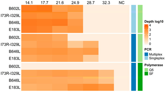 Sensitivity of singleplex and multiplex assays with Q5 DNA polymerase (Q5) and Platinum SuperFi II DNA polymerase (SF). Ten-fold serial dilutions of ASFV (with corresponding Ct values on the top of the graph, NC is the negative control) were tested using singleplex and multiplex PCR with the primer sets targeting four genomic regions (B602L, I73R-I329L, B646L, and E183L). The heat map shows the resulting mean sequencing depth in a log10 scale (gradient of orange, mean of three independent replicates). Corresponding mean and standard deviation are plotted in Figure S1.
