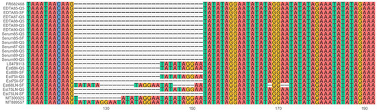 Multiple sequence alignment of the intergenic region between I73R and I329L genes (ECO1). To further discriminate genotype II ASFV, we aligned the I73R-I329L intergenic region sequences using the MAFFT aligner. The characteristic 10 nt long tandem-repeat sequence (TRS, TATATAGGAA) is repeated twice in the Georgia 2007 strain (IGR-I, FR682468), and the EDTA blood and serum samples show the same genotype. All the Estonia 2014 samples, amplified with the Q5 DNA polymerase, perfectly aligned to the Estonia 2014 reference (LS478113) in the IGR-II variant, which has the TRS repeated three times. The accession numbers MT300325 and MT889557 correspond to the variants IGR-III and IGR-IV with four and five times the TRS, respectively.
