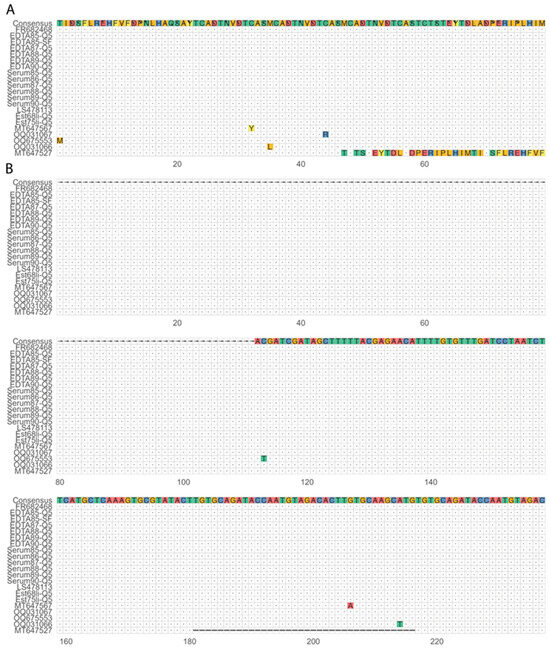 Multiple sequence alignments of the CVR region for genotype II sequences. (A) On the top of the alignment, the consensus sequence called from our samples and one representative for each known variant is represented. The translated CVR region has characteristic amino acid tetramer repeats, including some single nucleotide polymorphisms (colored amino acids), and in one variant (CVR2) a deletion of three amino acid tetramers (MT647527). All our samples belong to the variant CVR1, like the Georgia 2007 strain (FR682468). The other known CVR1 variants for genotype II ASFV are also aligned: CVR1-SNP1 (MT647567), CVR1-SNP2 (OQ031066), CVR1-SNP3 (OQ031067), and CVR1-SNP4 (OQ675553). (B) The nucleotide sequences of the same amplicon were also aligned, where all the samples sequenced in this study align without mismatches to the Georgia 2007 strain (FR682468).