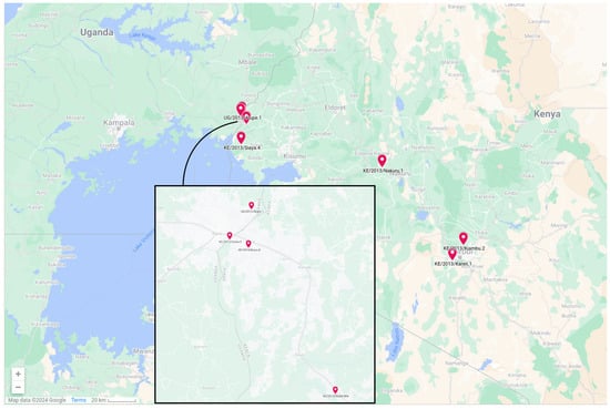 A subset of well-characterized ASFV-positive tissue samples was selected from a study in West and Central Kenya and Eastern Uganda []. The samples represented ASFV isolates obtained from different locations in Kenya and Busia district of Uganda in 2012 and 2013. The isolates were selected to represent a diverse spectrum of origins, including samples from outbreaks from multiple geographical locations and dates, long-term infections (isolated through horizontal sampling) and slaughter slabs. All were positive according to diagnostic PCR, but qPCR was not performed, so the viral copy number was unknown. A map of the sampling region is included in Figure 1, and the key metadata for the nine isolates are described in Table 1. The sequences of p72 and other polymorphic loci for these isolates, including the B602L chaperone encoding gene, are available in the INSDC databases. Five of these were sequenced following a single passage on porcine primary macrophages from domestic pigs, as described in [].