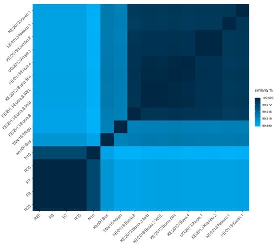 Using the whole-genome multiple sequence alignment of the 57 isolates we included in this study, we went on to create a raw sequence similarity matrix between all 16 sequences of Genotype IX, excluding gaps in a pairwise fashion, and recording the levels of sequence identity (Figure 3). All Genotype IX sequences exhibited very strong percentages of sequence similarity, the lowest level being 99.89%. The first representative of the Genotype IX clade, genome Ken06.Bus of INSDC accession KM111295 [], isolated from an outbreak in 2006, displayed high sequence similarity with the newly determined genomes, at a whole-genome level of 99.93% on average. Taken together, the genome sequences from p72 Genotypes IX and X are very distinct from all other genomes. Genotypes IX and X, however, comprise phylogenetically distinct groups (Figure 2). However, there is significantly more divergence within the Genotype X clade than within the Genotype IX cluster. Our phylogeny highlighted Genotypes II and IX as being very distant from each other, each one displaying very little internal diversity compared with the broad picture of ASFV worldwide. Such a relatively low level of divergence is probably a sign of high genetic fitness, underlying the fact these two genotypes are “doing well” while meeting little to no evolutionary pressure, each in their own geographic area of prevalence.
