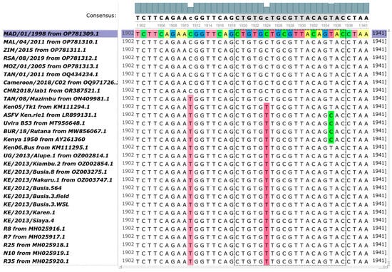The 19-nucleotide p72D primer (e.g., starting at Position 97,398 of E75) reads 5′ GT/ACT/GTA/ACG/CAG/CAC/AG 3′ on the top strand and, therefore, is complementary to the sequence of the B646L CDS. Here again, we indicated the codons’ boundaries with slashes. At the third position of p72D, four of the five full-genome sequences of Genotype X (Kenya 1950, Uvira B53, BUR/18/Rutana and Ken.rie1) exhibited a polymorphism, with a G instead of an A (a synonymous SNP, since both AGT and AGC code for a serine). Further into p72D, at Position 14 of the primer, there was a G/A SNP (at Position 97,411 in E75 and Position 100,990 in the KE/2013/Busia.3.WSL full-genome sequence) that was common to all Genotype IX and X sequences, including all nine newly sequenced Genotype IX ASFVs presented here. Although in the first codon position on the coding strand, it is synonymous, since both the codons CTG and TTG code for a leucine (L). Despite the fact that the pair p72U/p72D has been used successfully for decades in the detection of African swine fever virus, including viruses of Genotypes IX and X [,], it is not completely out of question that such a polymorphism towards the end of a primer may decrease the efficiency of the annealing and might lead to detection errors in diagnostic assays based on the amplification of that region. In Figure 4, we represent the multiple sequence alignments of the end of the B646L CDS for all Genotypes IX and X in this study, contrasting with the other sequences and clearly displaying the two polymorphisms described above in the reverse complement of p72D.