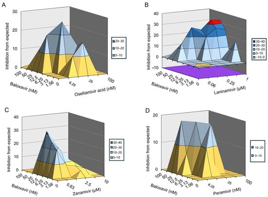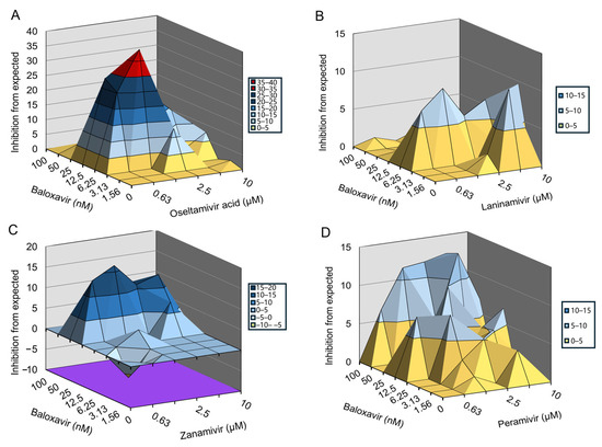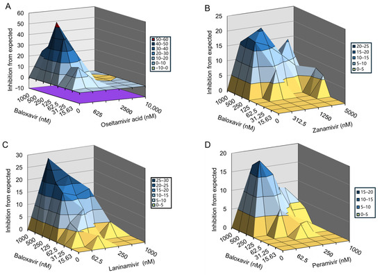 Oseltamivir acid, zanamivir, laninamivir, and peramivir do not inhibit H1N1-PR8-R292K infection-induced CPE in MDCK cells. Therefore, we evaluated the synergetic effects of baloxavir and NAIs using an 8 × 6 combinatorial design by monitoring CPE in MDCK cells. The data were plotted and analyzed using the MacSynergy II software. The results showed that baloxavir combined with oseltamivir acid or peramivir significantly prevented H1N1-PR8-R292K infection-induced CPE in a dose-dependent manner (Figure 3A,D). Baloxavir combined with laninamivir or zanamivir slightly prevented H1N1-PR8-R292K infection-induced CPE (Figure 3B,C). For the combination of baloxavir with oseltamivir acid or peramivir, the volume of synergy was 287.87 µM2% or 138.87 µM2%, respectively, at 95% confidence levels, which suggested strong synergy effects against H1N1-PR8-R292K in vitro. For the combination of baloxavir with laninamivir or zanamivir, the volume of synergy was 72.3 µM2% or 93.35 µM2%, respectively, at 95% confidence levels, which is defined as a moderate synergy effect against H1N1-PR8-R292K in vitro (Table 3). In summary, the co-administration of baloxavir and NAIs exhibited synergistic effects in suppressing NAI-resistant strains.